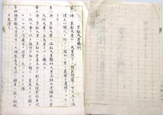 京都大学を設立するための建議を説明し、文部大臣宛に提出した明治27年から遡ること3年、九鬼隆一君旧草稿ノ分「秘書 京都大学条例」と記された元本が