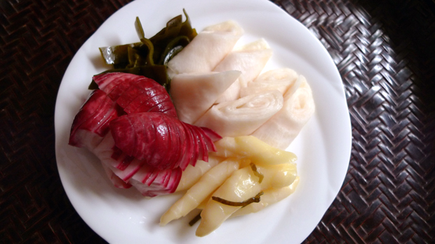 聖護院大根のお漬けものと赤かぶ、それにお年寄りの方には食べやすく切ってある日野菜漬がおすすめとのことでした。